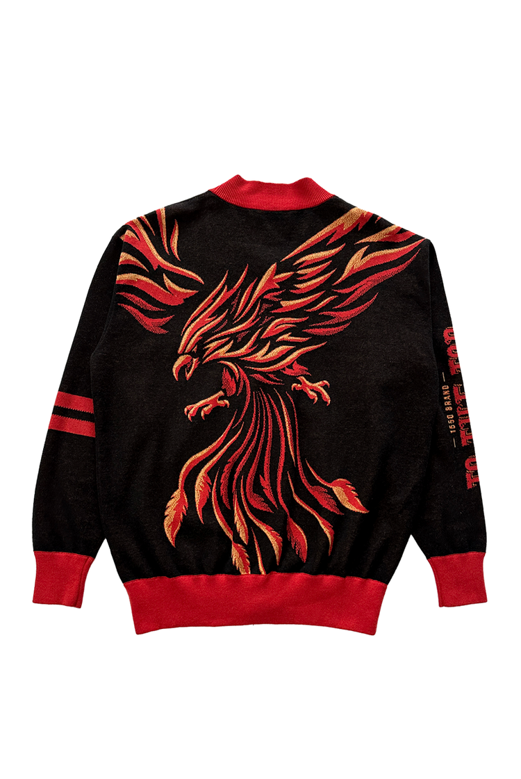 This one is for the fire inside you. The phoenix inside you. Rise from the ashes in our dope AF From the Ashes cardigan. And make sure you pair it with our matching From the Ashes knit beanie. Our premium knit sweaters feature the pattern knitted directly into the fabric.